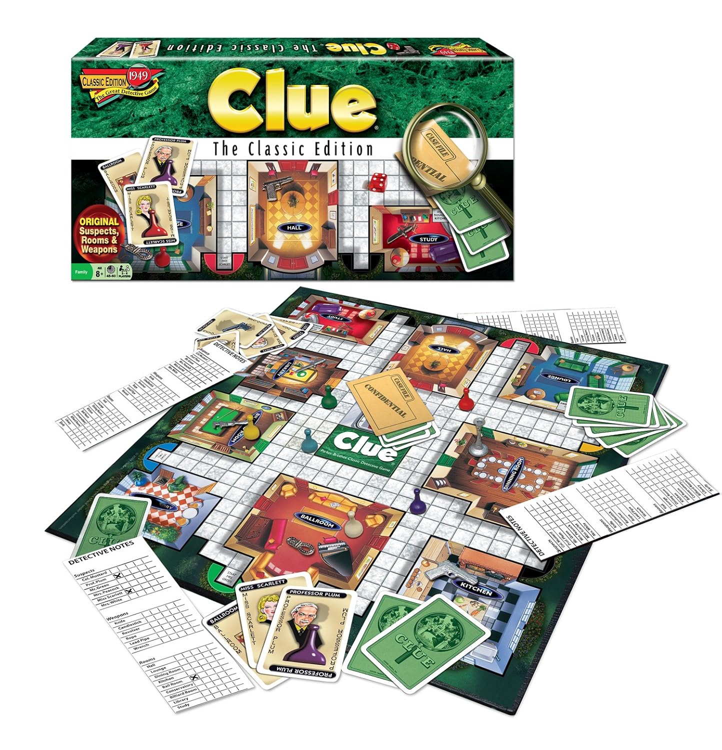 The suspects you know, in the mansion you remember, with the weapons you love. Ages 8 and Up. 3-6 Players. Game board. 6 suspect tokens. 6 weapons. Deck of suspect. Weapon and room cards.